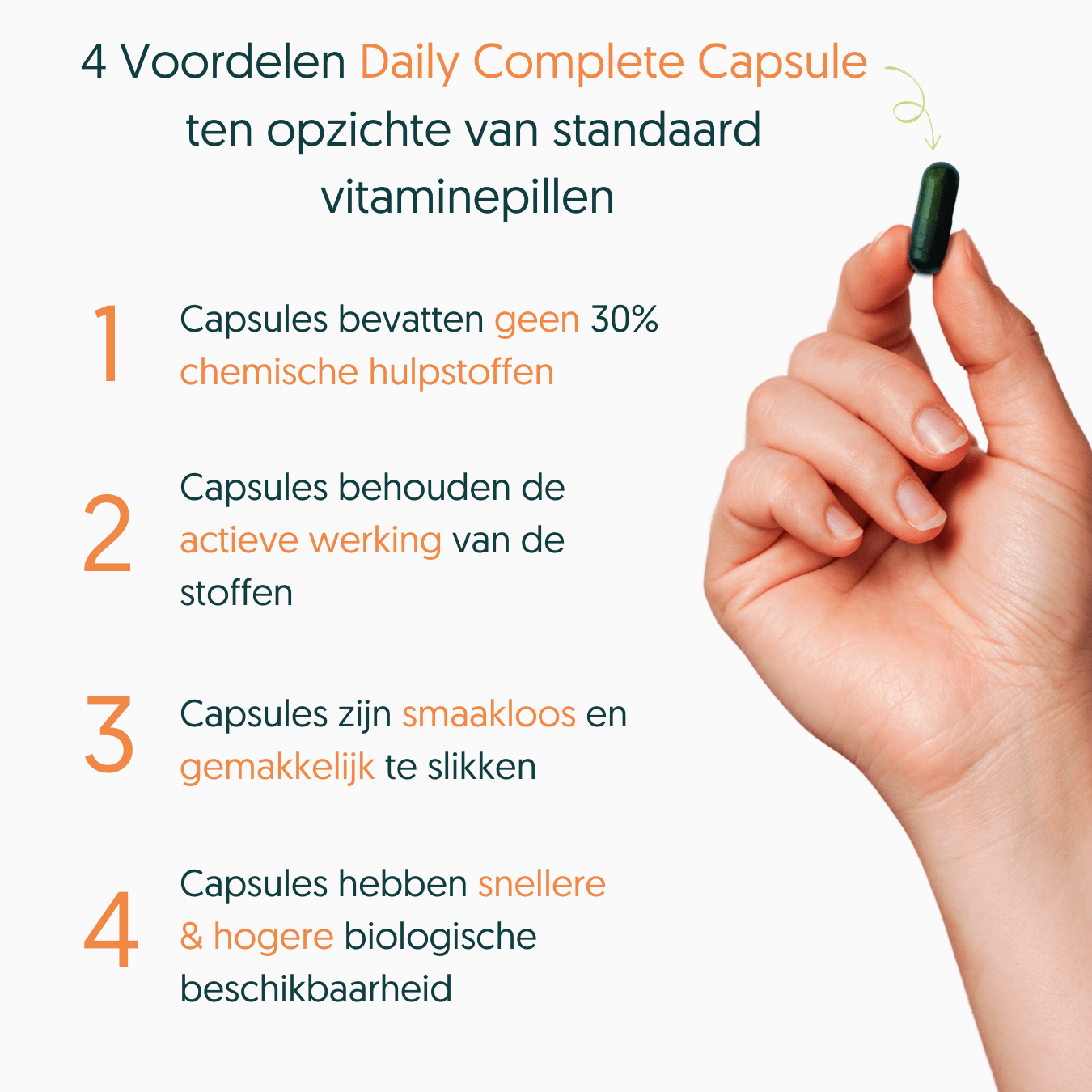 De meeste supplementen worden verkocht in tabletvorm, maar tabletten bevatten vaak minimaal 30% chemische hulpstoffen om de ingrediënten te binden. Capsules, zoals de Daily Complete Cap, hebben deze stoffen niet nodig, waardoor er meer ruimte is voor de ingrediënten die er echt toe doen. Onze Optimal Release Cap zorgt ervoor dat de ingrediënten binnen 15 minuten na inname vrijkomen voor optimale opname en effectiviteit. Daarnaast zijn capsules smaakloos, makkelijk door te slikken en milieuvriendelijker dan tabletten, doordat ze minder energie en stroom verbruiken bij de productie. Dit maakt onze Daily Complete Cap niet alleen effectiever, maar ook duurzamer.