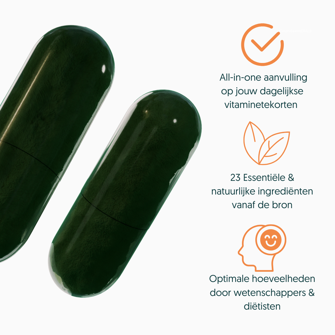 Onze ervaring en frustraties met de bestaande markt hebben geleid tot uitgebreid onderzoek en ontwikkeling van een unieke formule. Deze formule is gericht op het aanvullen van dagelijkse tekorten aan vitamines, mineralen, vetzuren, antioxidanten en plantenextracten zoals Omega 3, Magnesium, IJzer, Zink en bosbessenextract. Na een lange periode van testen zijn we trots op onze Daily Complete formule, die is samengesteld op basis van jouw behoeften en niet om zoveel mogelijk producten te verkopen. We gebruiken alleen natuurlijke, biologische en actieve ingrediënten, rechtstreeks van de bron en geproduceerd volgens de hoogste farmaceutische normen.